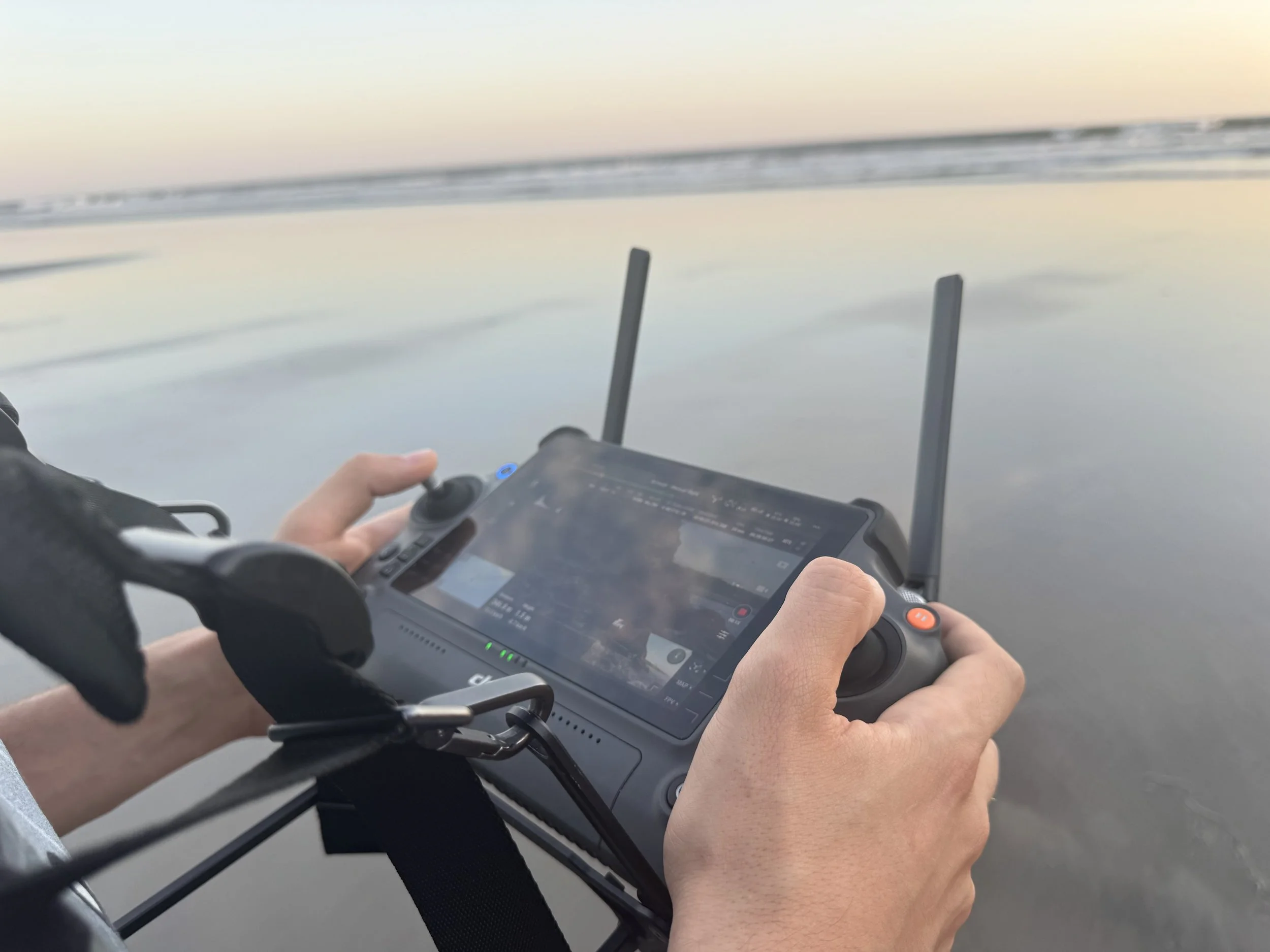 The closest we came to disaster was at the rock cliffs near the coast. We needed this shot flying parallel to the formations, low over the water, with waves crashing below. The problem? We were operating the drone from a kilometer away with no visual contact. Just guessing the distance between the drone and the waves by watching a screen.