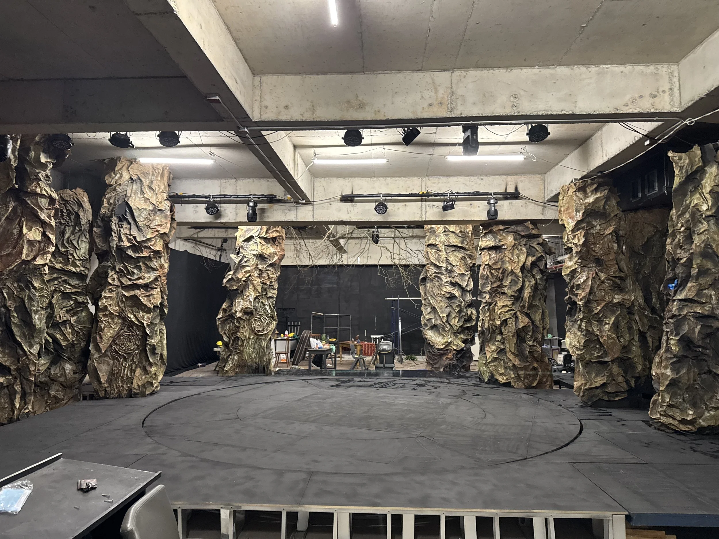 These "light walls" allowed us to transform depth dynamically. A scene could play out on the turntable's front edge while the cast set up the next environment behind the curtain in darkness. When the platform rotated, you'd suddenly see what had been constructed - not gradually revealed, but appearing fully formed.